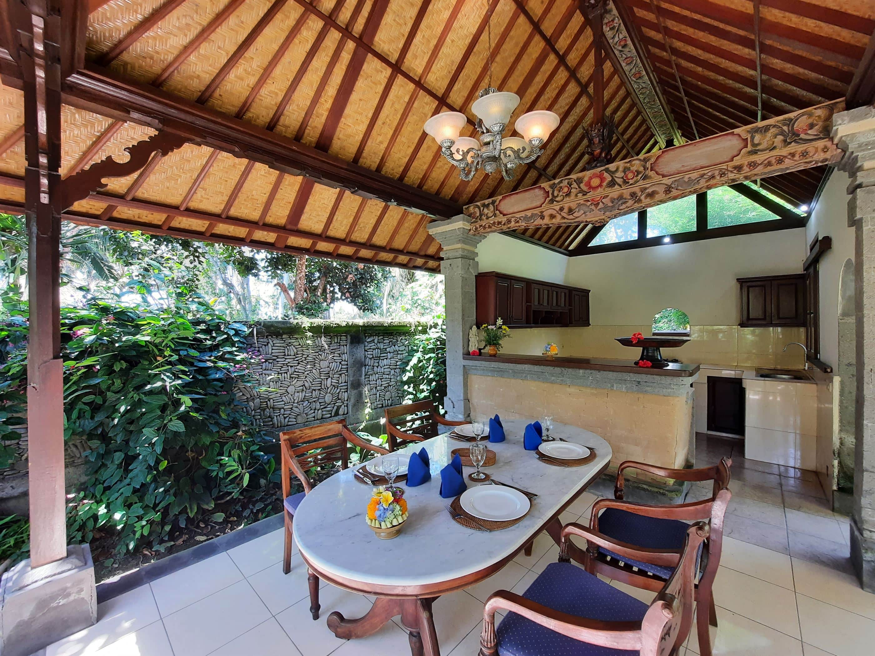 Looking out to lush gardens, feel serene and at home. The bedroom with one Queen bed and a single bed has both air-conditioning and ceiling fan. The bathroom has a bathtub and separate shower. A gazebo with a kitchen and dining space is available for private or shared use. Meals may also be taken in the privacy of your room. Our staff are always available to make your stay comfortable and memorable. A short walk brings you to the common pool and Alam Shanti Spa.