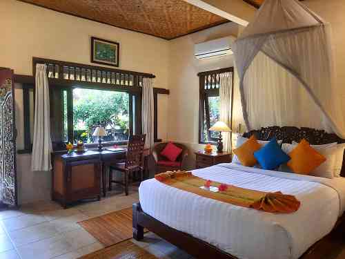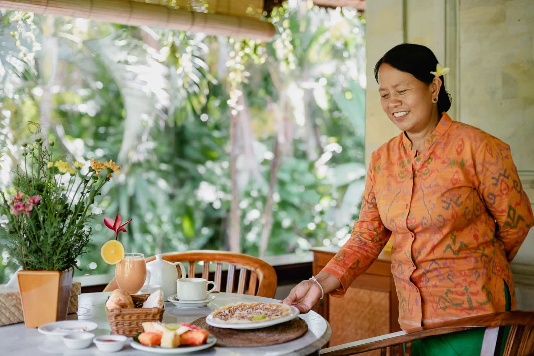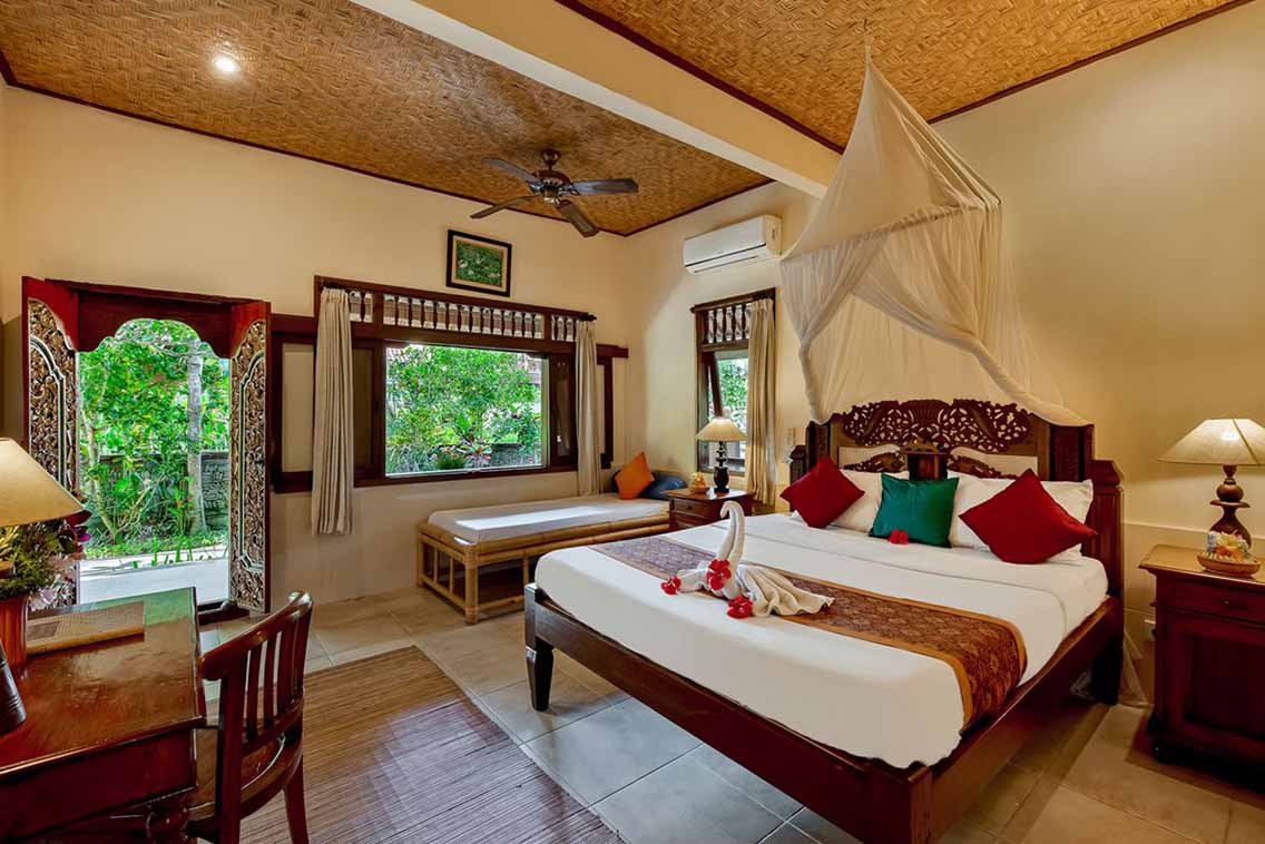 This is the original guesthouse of Ibu Wayan and Pak Ketut where guests and friends have come to stay since 1987. There are seven rooms with garden or pool view including a two-bedroom family suite. Located off the Pengosekan Road, a flat walk of 130 meters leads you to the entrance of Kebun Indah. Entering the gardens feels like the oasis it has been for over 30 years. Our staff will pamper you with yummy breakfasts from the Cafe Wayan Bakery and are also happy to provide in-house meals. Several restaurants are also located within easy walking distance.