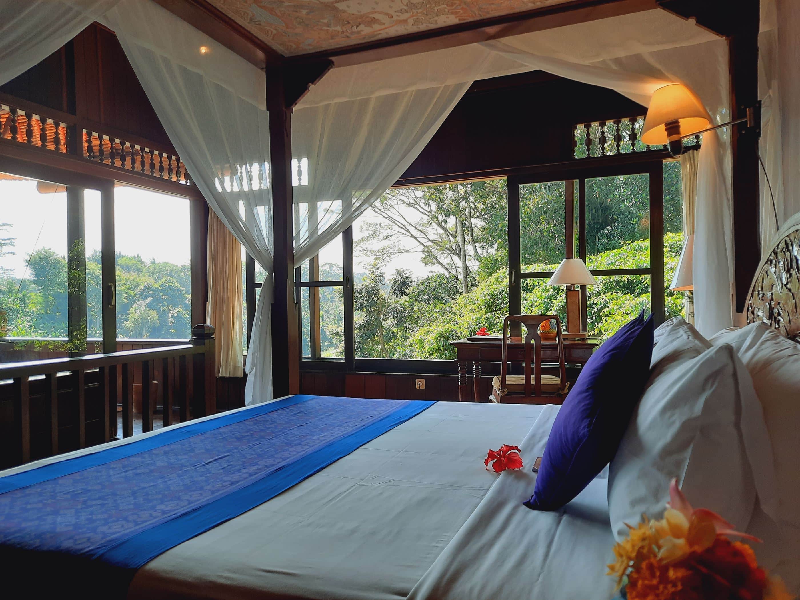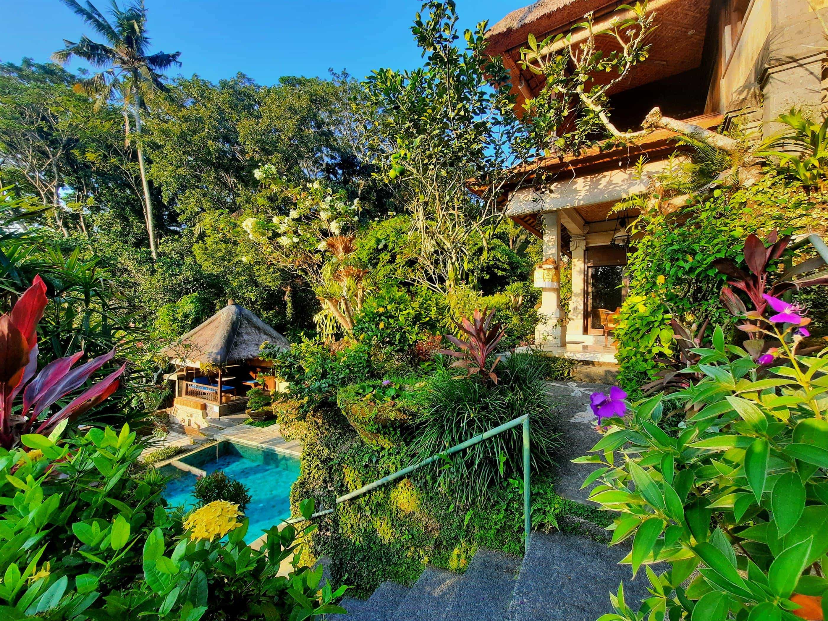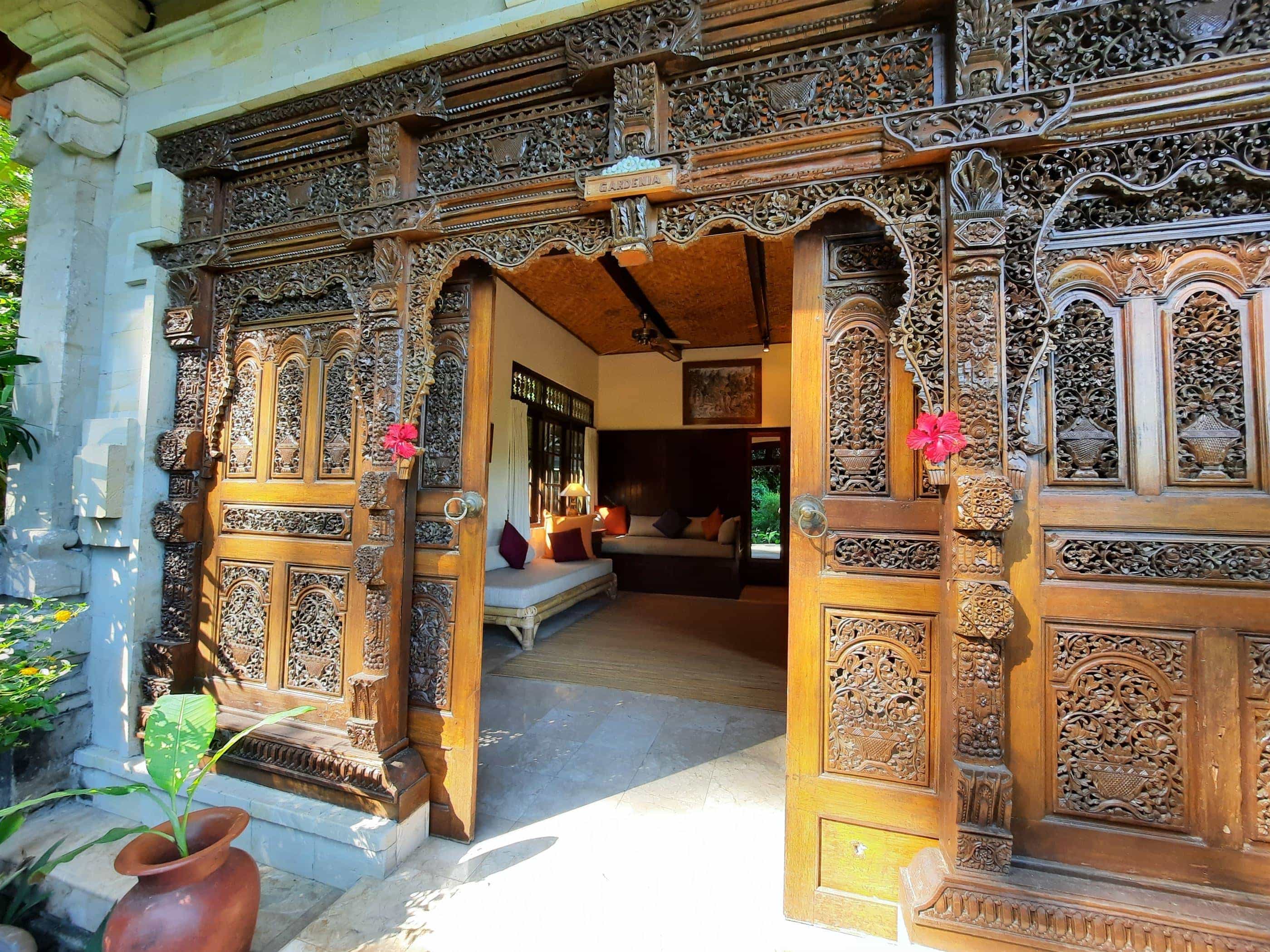 The upstairs bedroom has a Queen size bed, a writing desk and outdoor lounge space overlooking the beautiful valley and the Monkey Forest. The upstairs bathroom with tub and shower also enjoys this lovely view. The lower level entry is graced with an intricately carved Javanese door. A lounge space has a single sofa bed for family or friends sharing as well as a full bathroom with tub and separate shower amidst Bapak’s stone carvings.