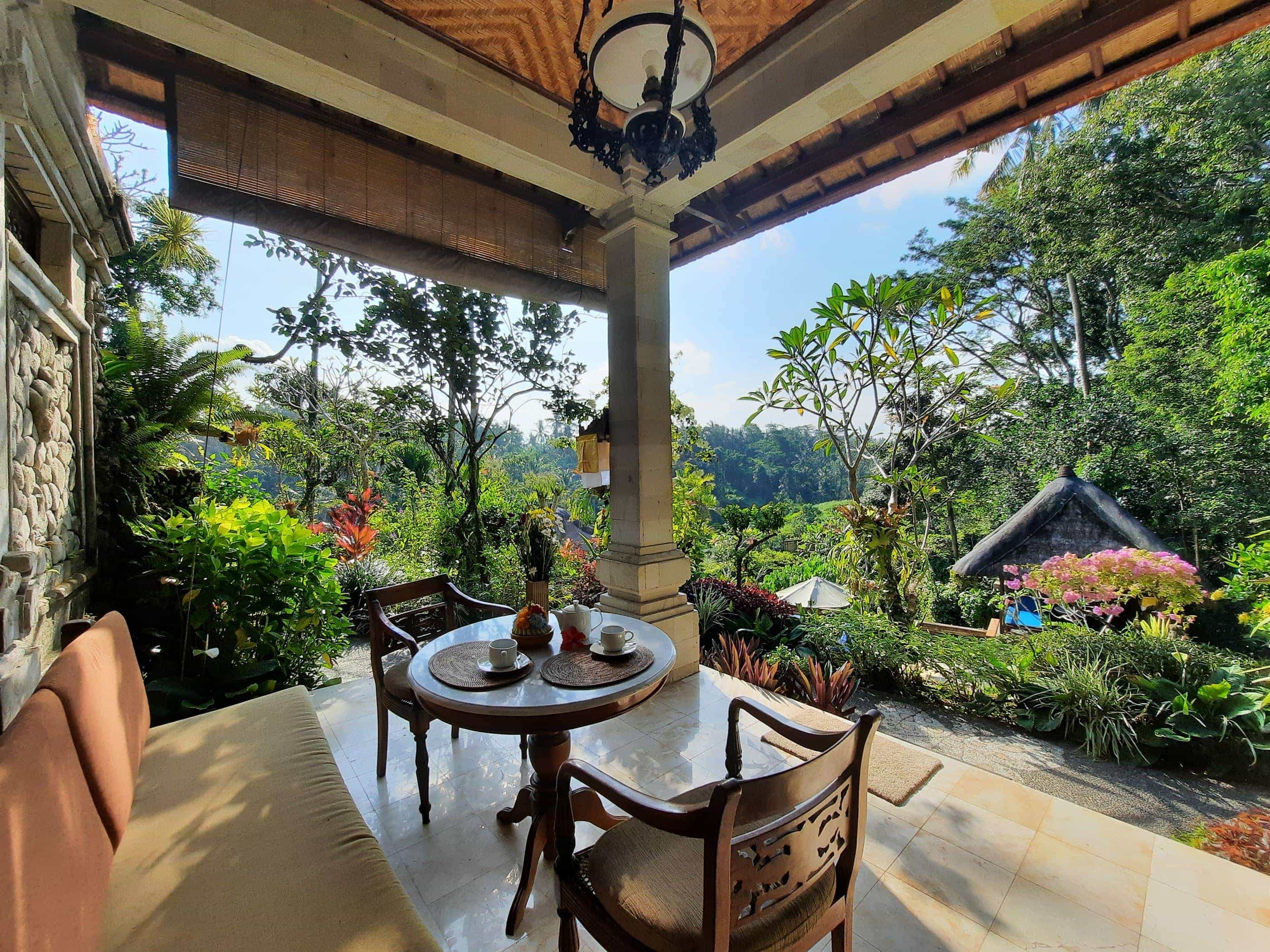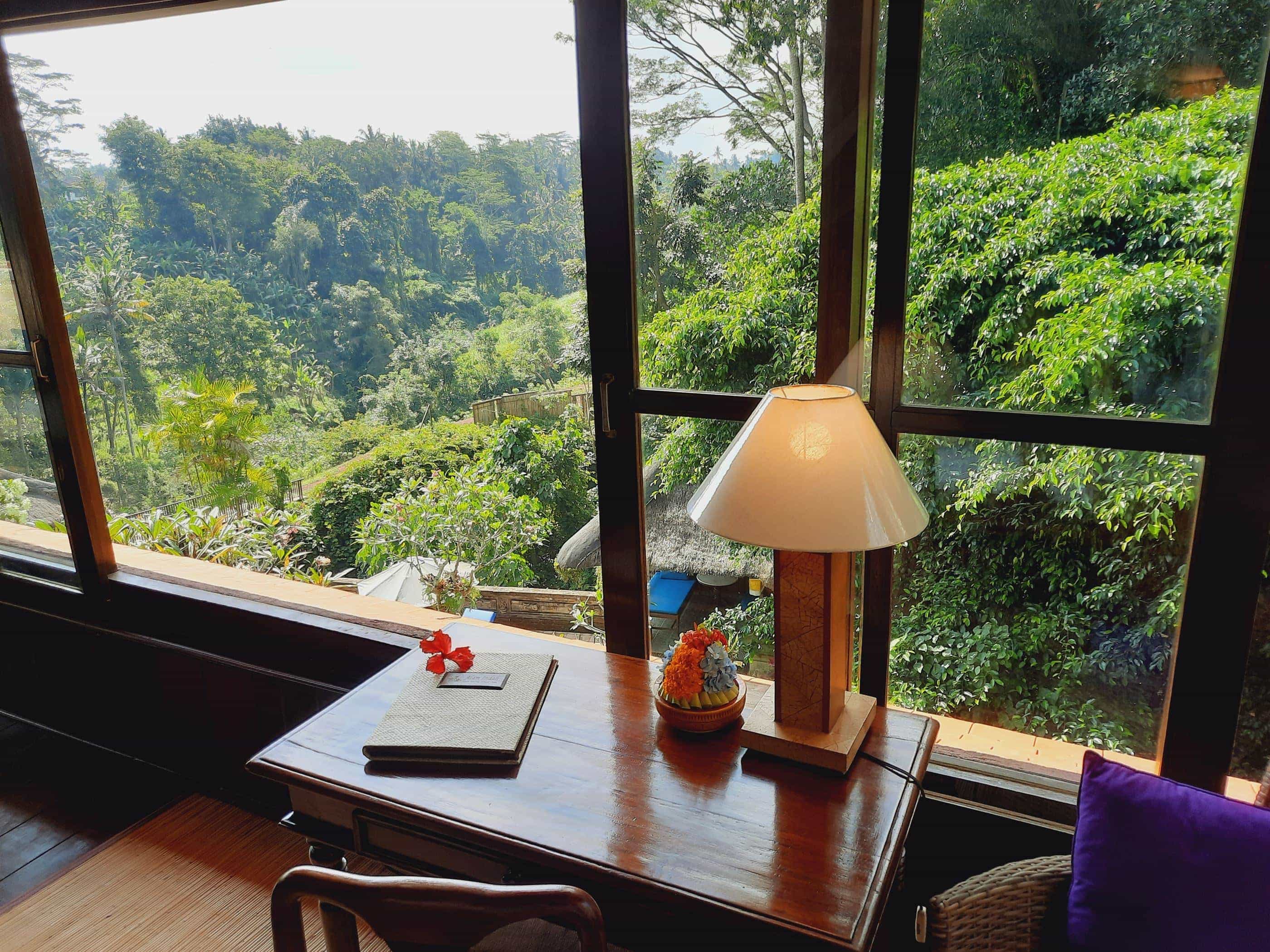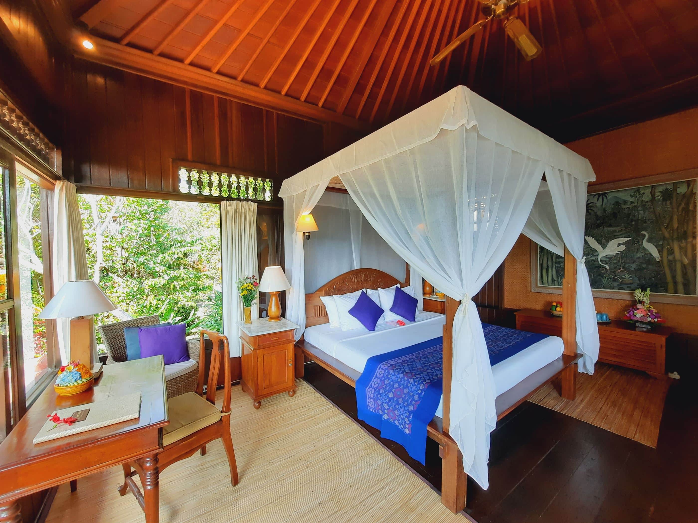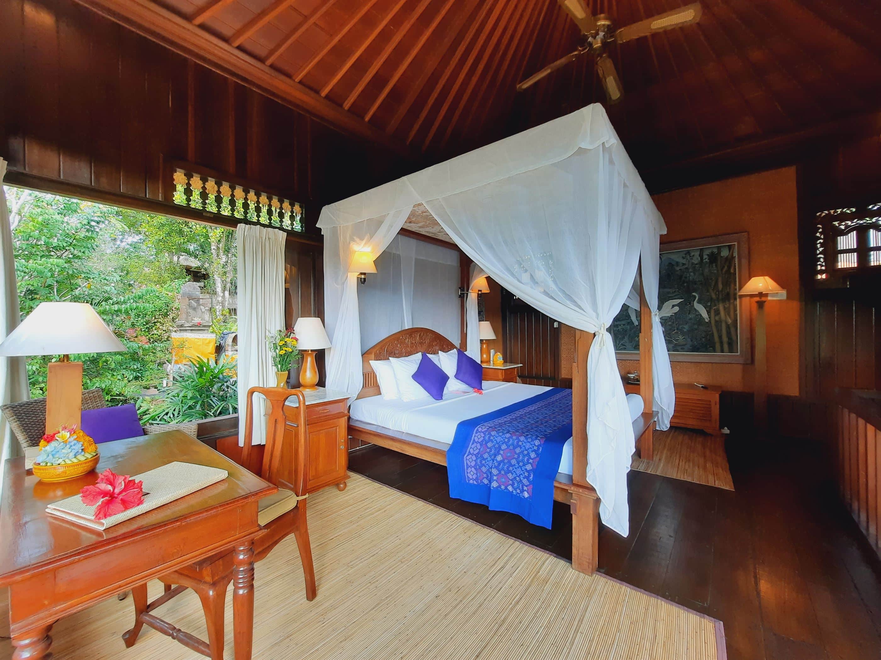The upstairs bedroom has a Queen size bed, a writing desk and outdoor lounge space overlooking the beautiful valley and the Monkey Forest. The upstairs bathroom with tub and shower also enjoys this lovely view. The lower level entry is graced with an intricately carved Javanese door. A lounge space has a single sofa bed for family or friends sharing as well as a full bathroom with tub and separate shower amidst Bapak’s stone carvings.