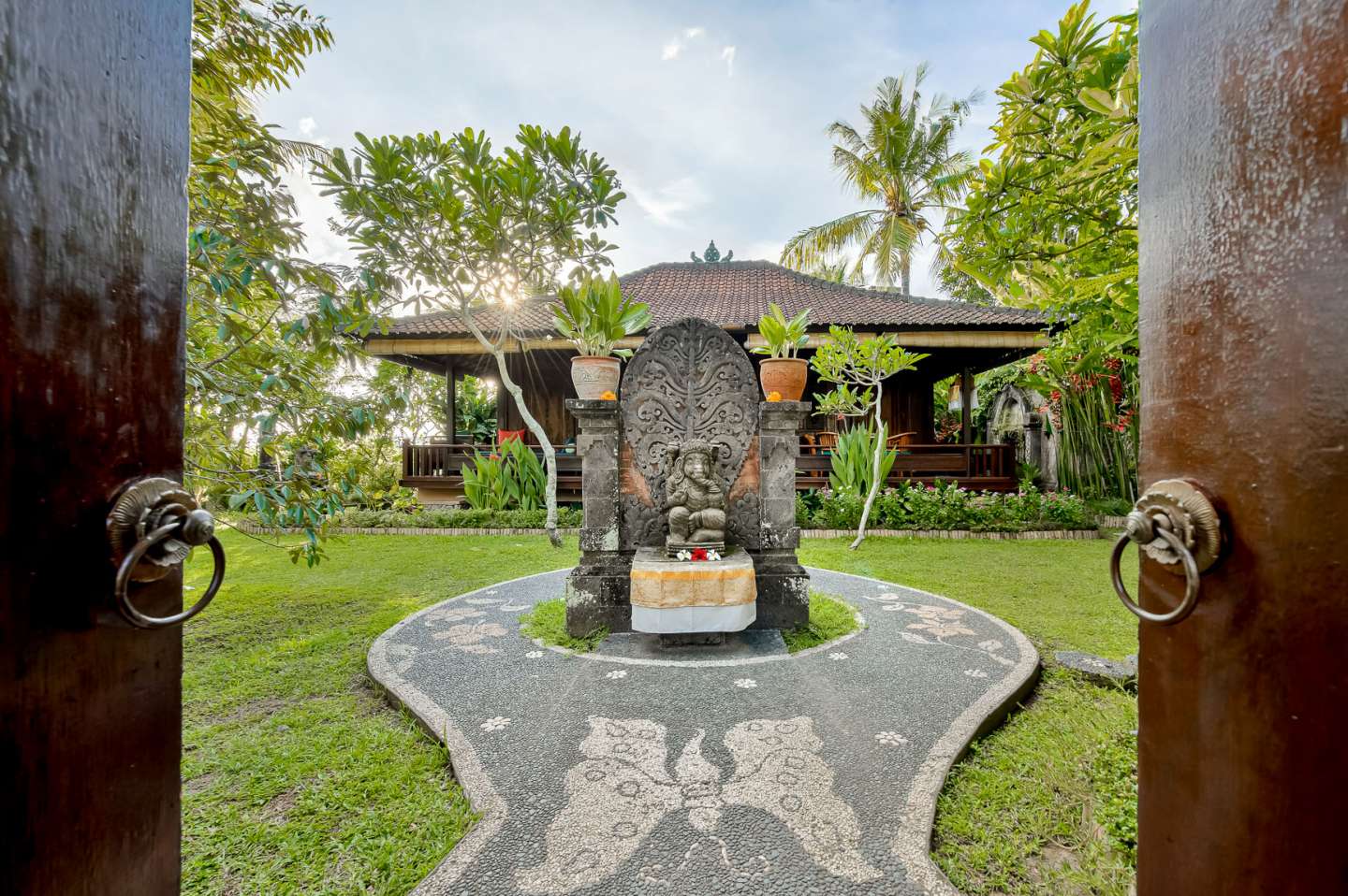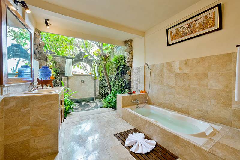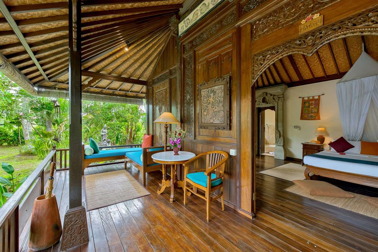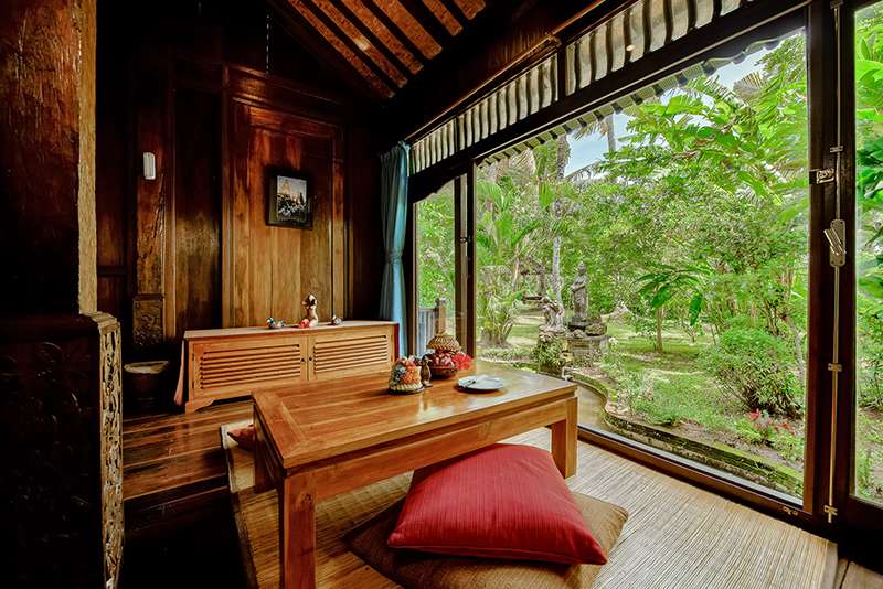 Jatayu is a beautifully restored wooden “Joglo” house from Java. Set in a private garden, a spacious outdoor terrace space invites you to enjoy open-air Bali living. The large bedroom also has a cozy sitting area. The bathroom with a bathtub and an open-air shower is graced with stone carvings created by Bapak and his local artisan friends. The bedroom has air-conditioning as well as ceiling fan to allow windows open with natural breezes. Enjoy this private garden oasis with our staff always available to make your stay comfortable and memorable.