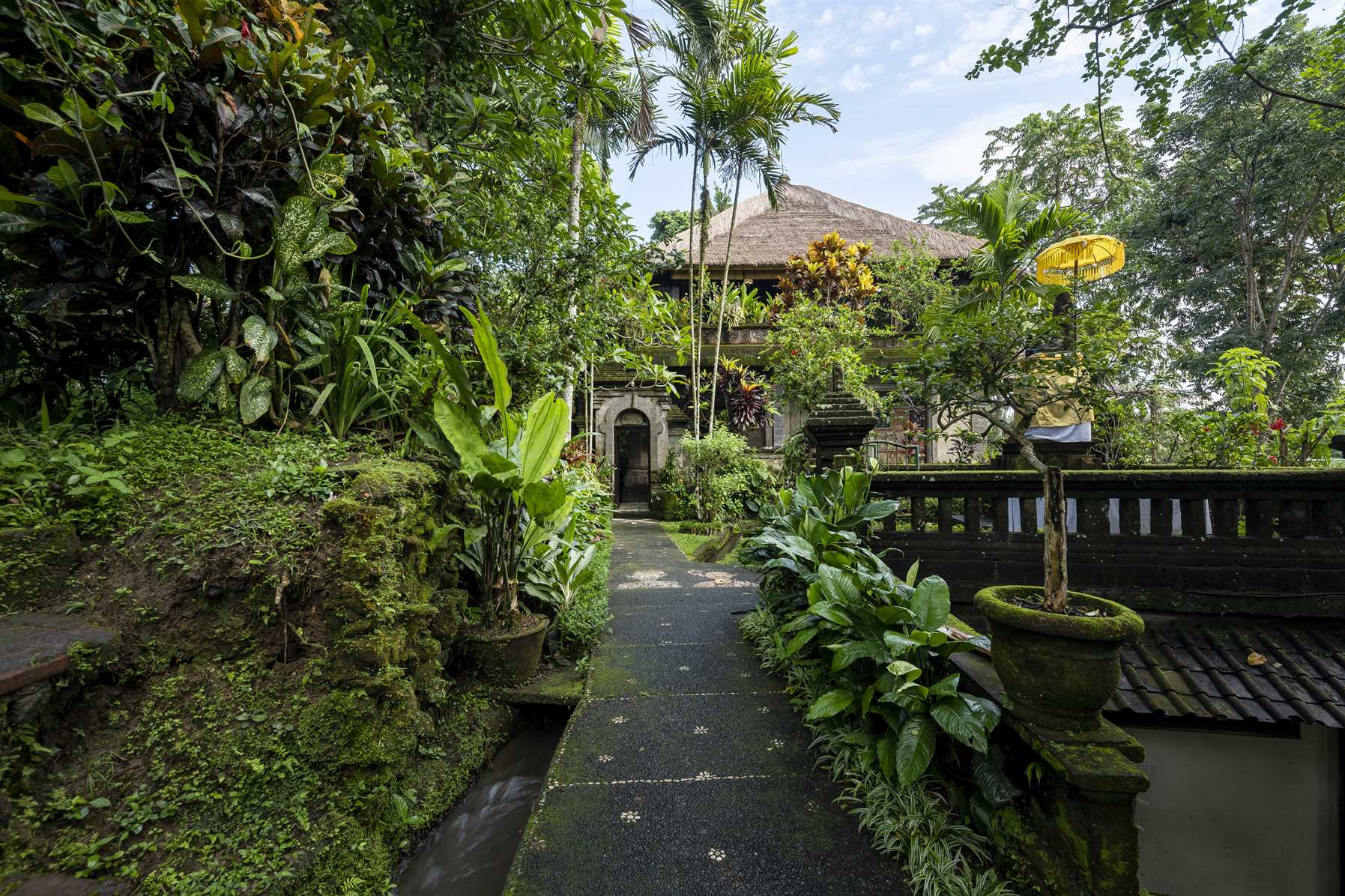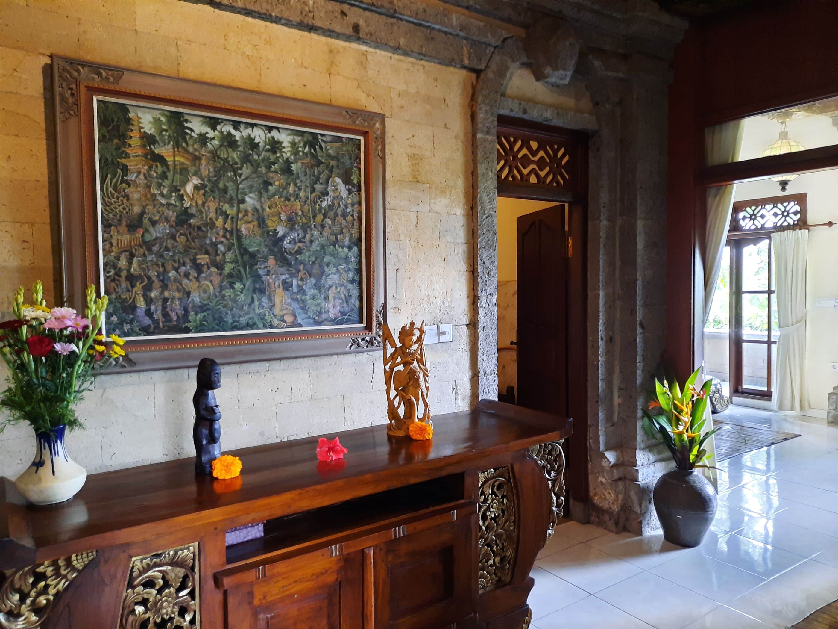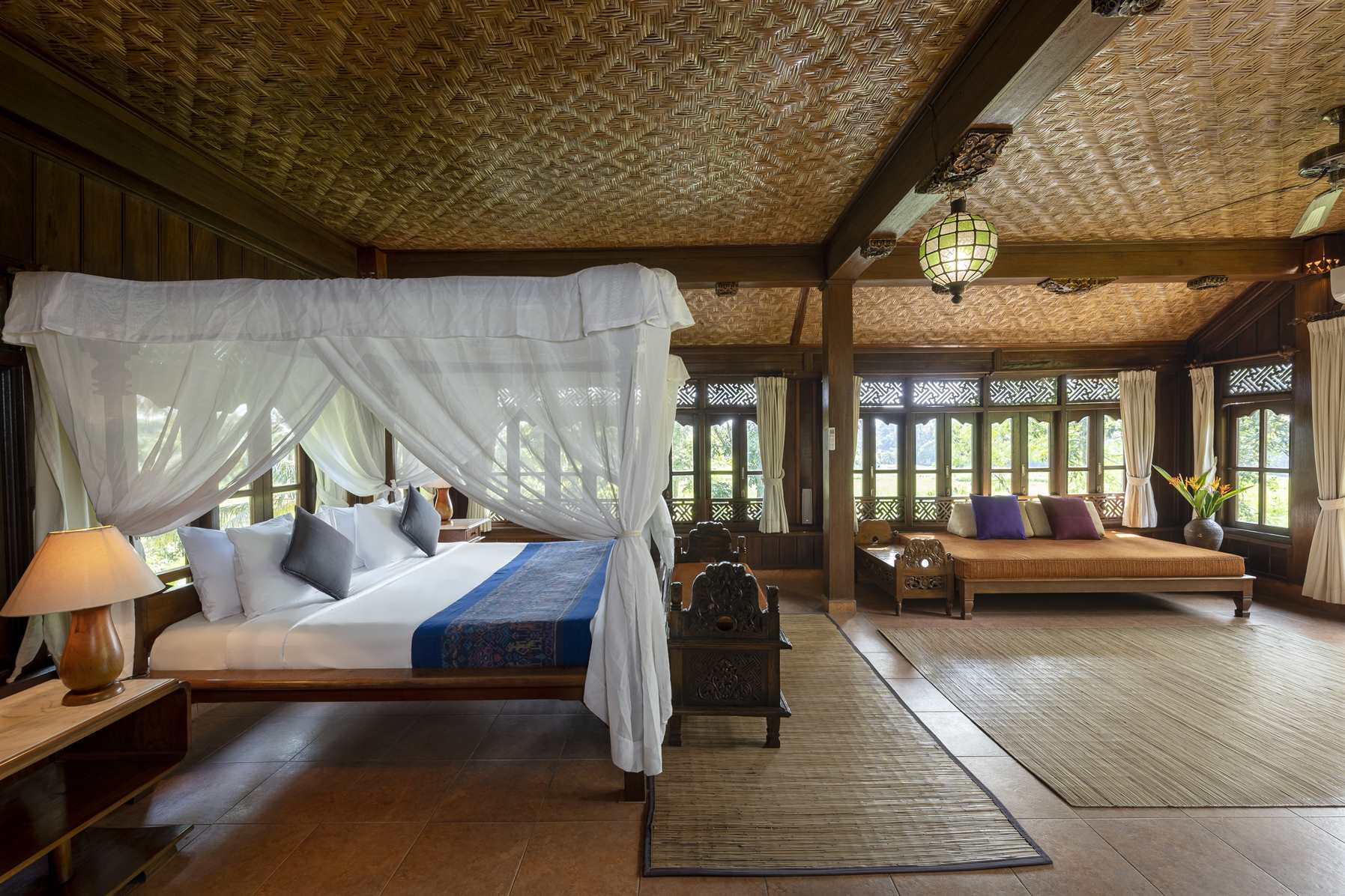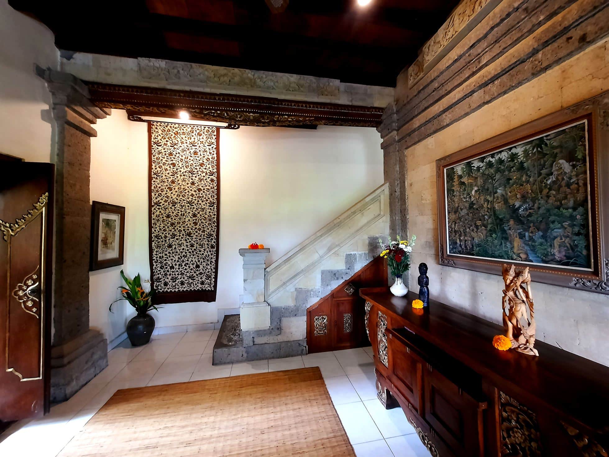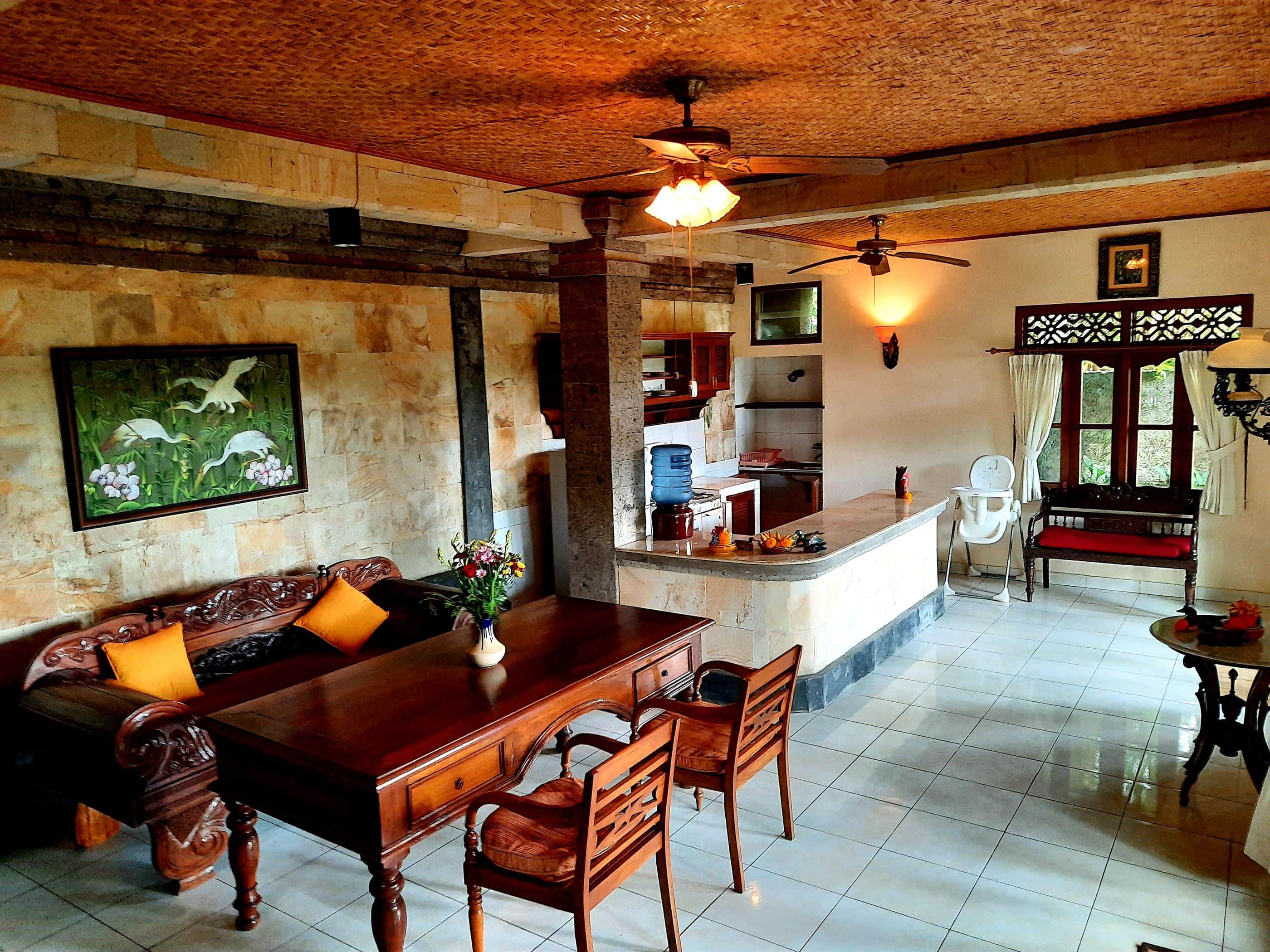 The upper level has a master bedroom with one Queen bed and a sofa bed. Warm wooden walls and traditionally carved doors with a lounge and garden terrace -a lovely space to enjoy meals. The bathroom has a tub as well as an open-air shower. Both bedrooms have air-conditioning as well as ceiling fans to allow windows open with natural breezes.