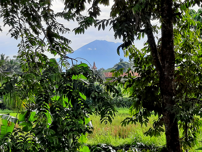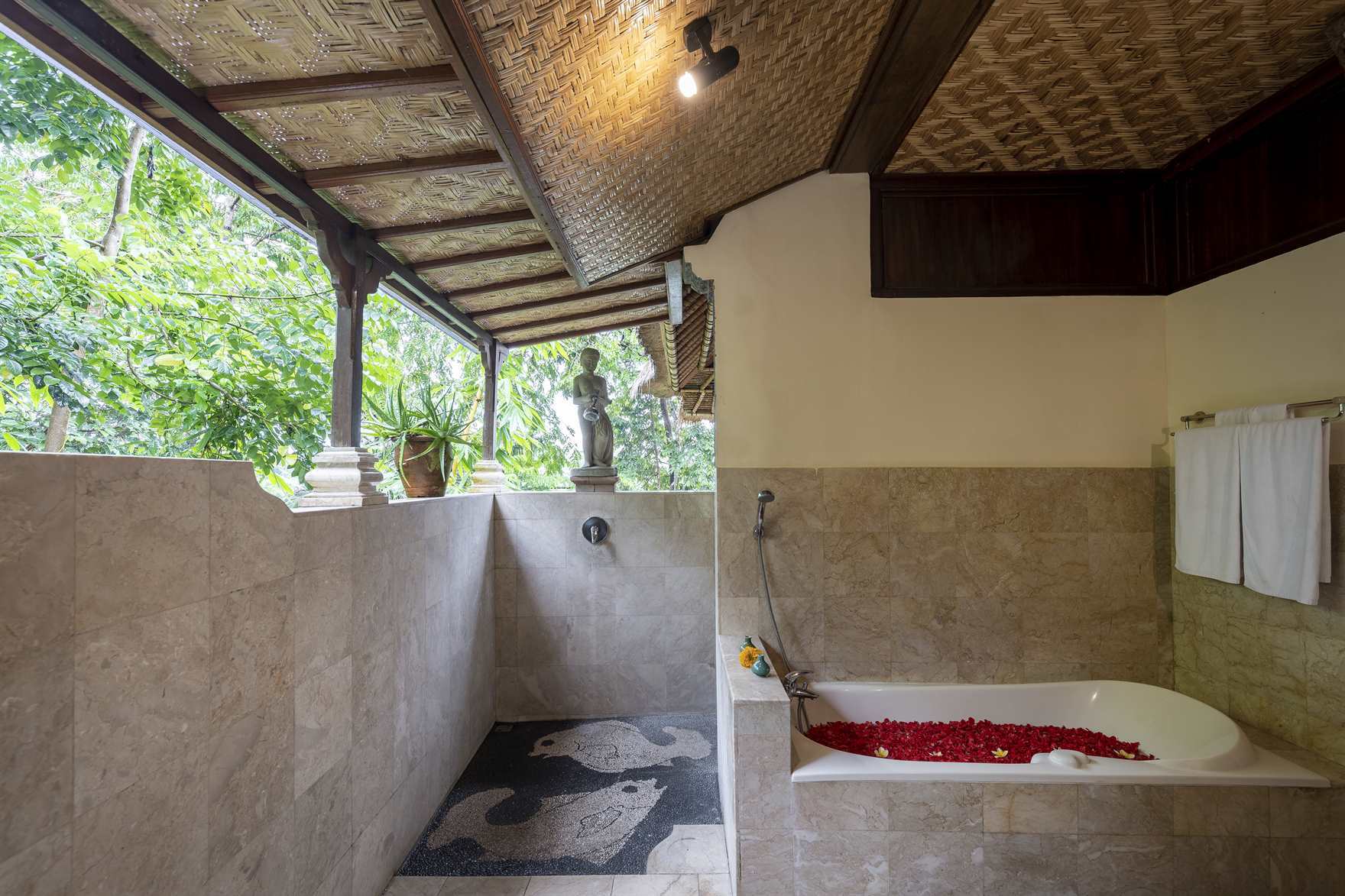 This two-bedroom private villa ideal for families or friends. The ground level opens into a foyer and to a large bedroom with living space with one King-size Bed and a sofa bed. A terrace space invites you to enjoy views of nature along a flowing stream. Skies permitting, you may see of Mt. Agung in the distance.The ground level has a full bathroom with a large tub and an open-air shower.