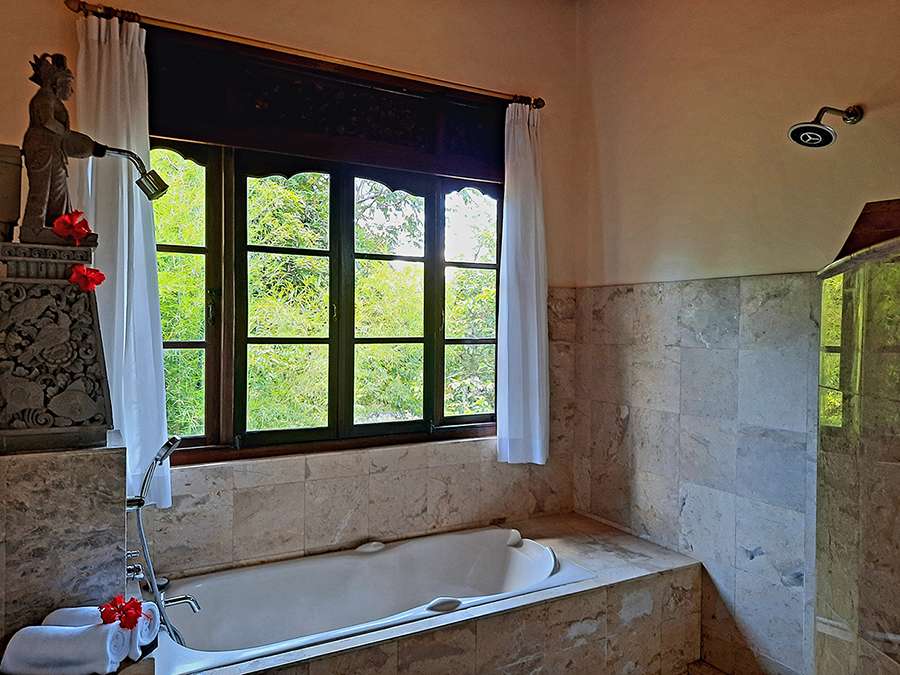 Looking out to the lush gardens, feel serene and at home. The bedroom has one Queen bed and a single bed, air-conditioning as well as ceiling fan. The bathroom has a bathtub and a separate shower, Indus is ideal for couples, singles or friends and family sharing. A gazebo with a kitchen and dining space is available in the garden for private or shared use. You may also enjoy meals in the privacy of your room. Our staff are always available to make your stay comfortable and memorable.
