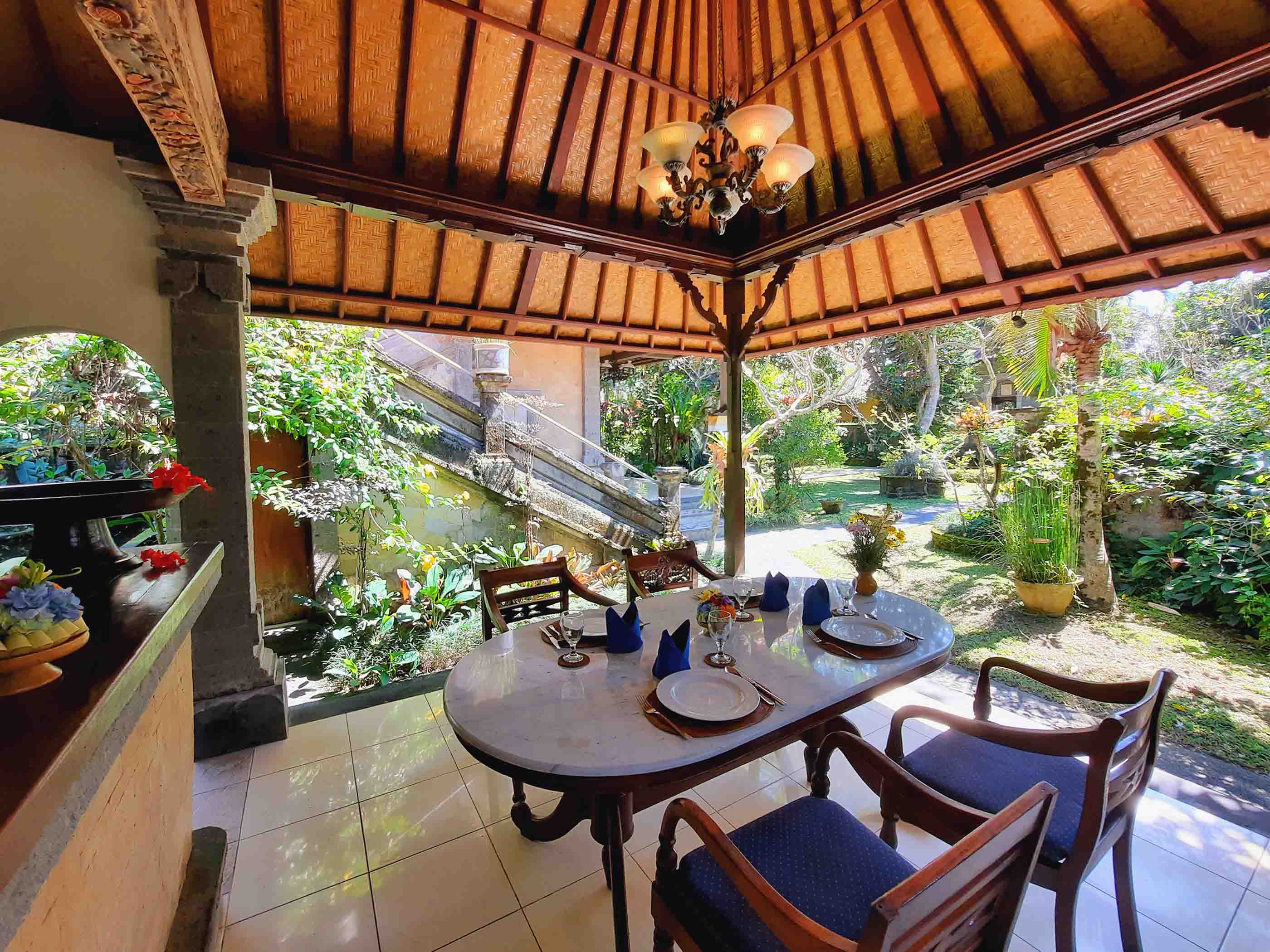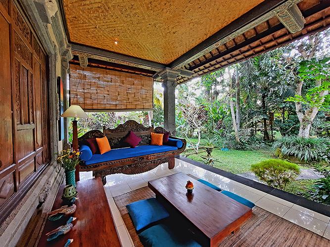 Looking out to lush gardens, feel serene and at home. The bedroom with one Queen bed and a single bed has both air-conditioning and ceiling fan. The bathroom has a bathtub and separate shower. A gazebo with a kitchen and dining space is available for private or shared use. Meals may also be taken in the privacy of your room. Our staff are always available to make your stay comfortable and memorable. A short walk brings you to the common pool and Alam Shanti Spa.