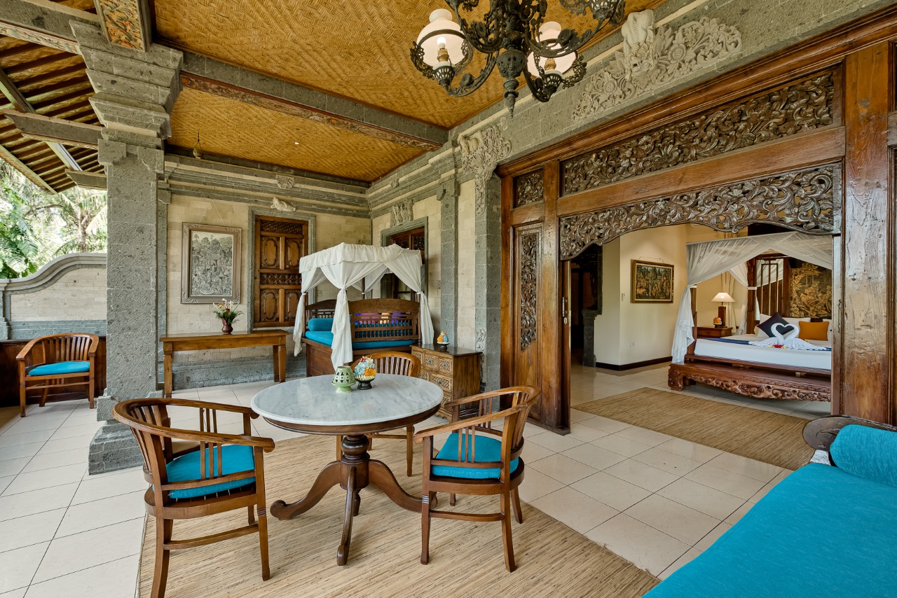 Amidst lush gardens, feel at home in this luxurious space. Facilities include a writing desk, dressing room, mini-fridge and coffee/tea maker. A spacious garden bathroom includes a bathtub and shower. Ideal for couples, singles, friends or families enjoying a luxurious Balinese experience. Enjoy relax time at the private pool shared with the upper level Gangga Suite.