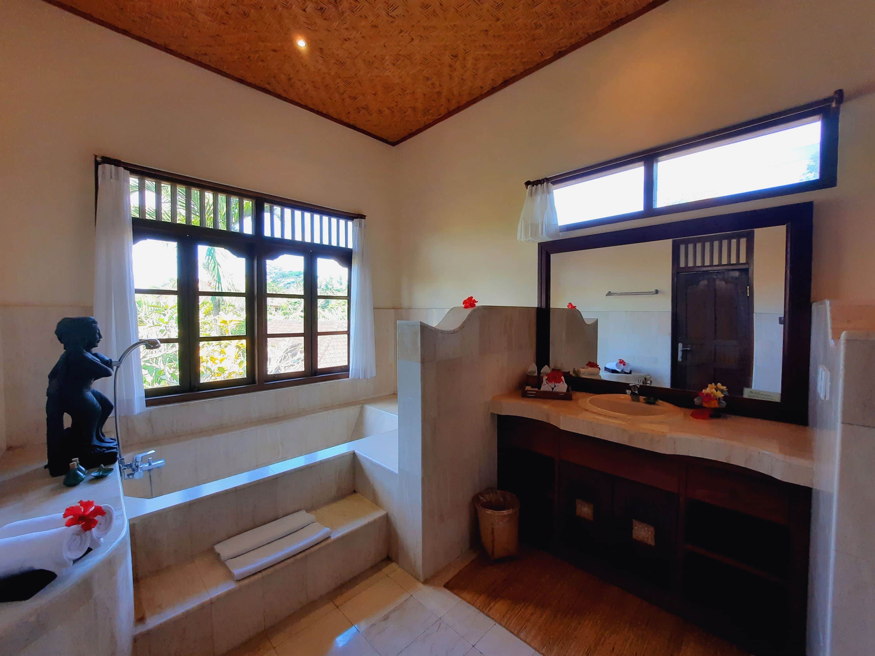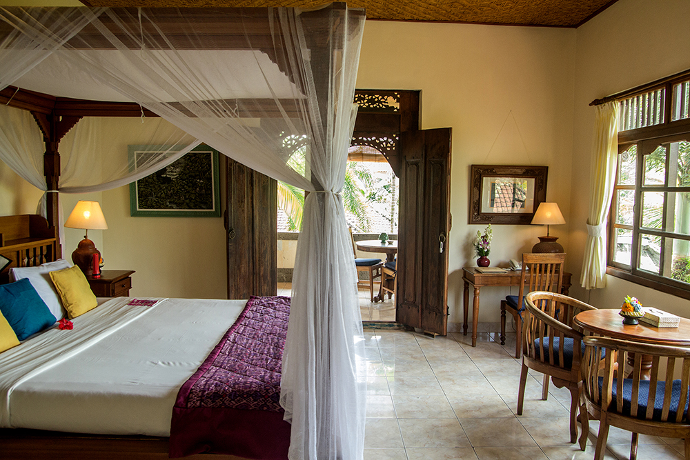 The Saraswati bedroom has both air-conditioning and ceiling fan. The bathroom features a tub with shower. The open-air living veranda has a dining table with a mini-fridge. There is a large work table and two day beds- ideal for singles, familes or friends sharing the space. Enjoy meals in the privacy of your room, or in the shared dining space and kitchen on the lower level. This is a place to feel at home. Our staff are always available to make your stay comfortable and memorable. A short walk brings you to the common pool and Alam Shanti Spa where you may endulge in traditional massage and aromatherapy treatments.